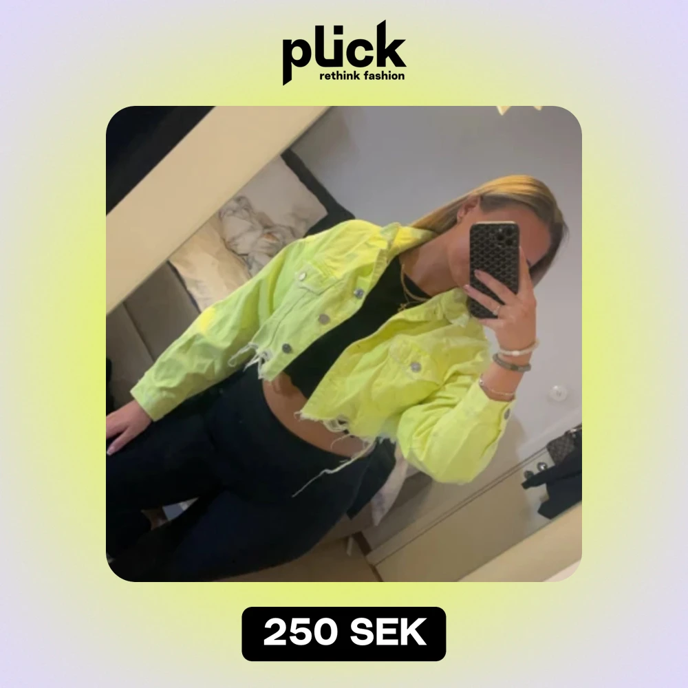 Skit snygg neon grön/gul kort jeans jacka med slitningar. Köpt i Spanien