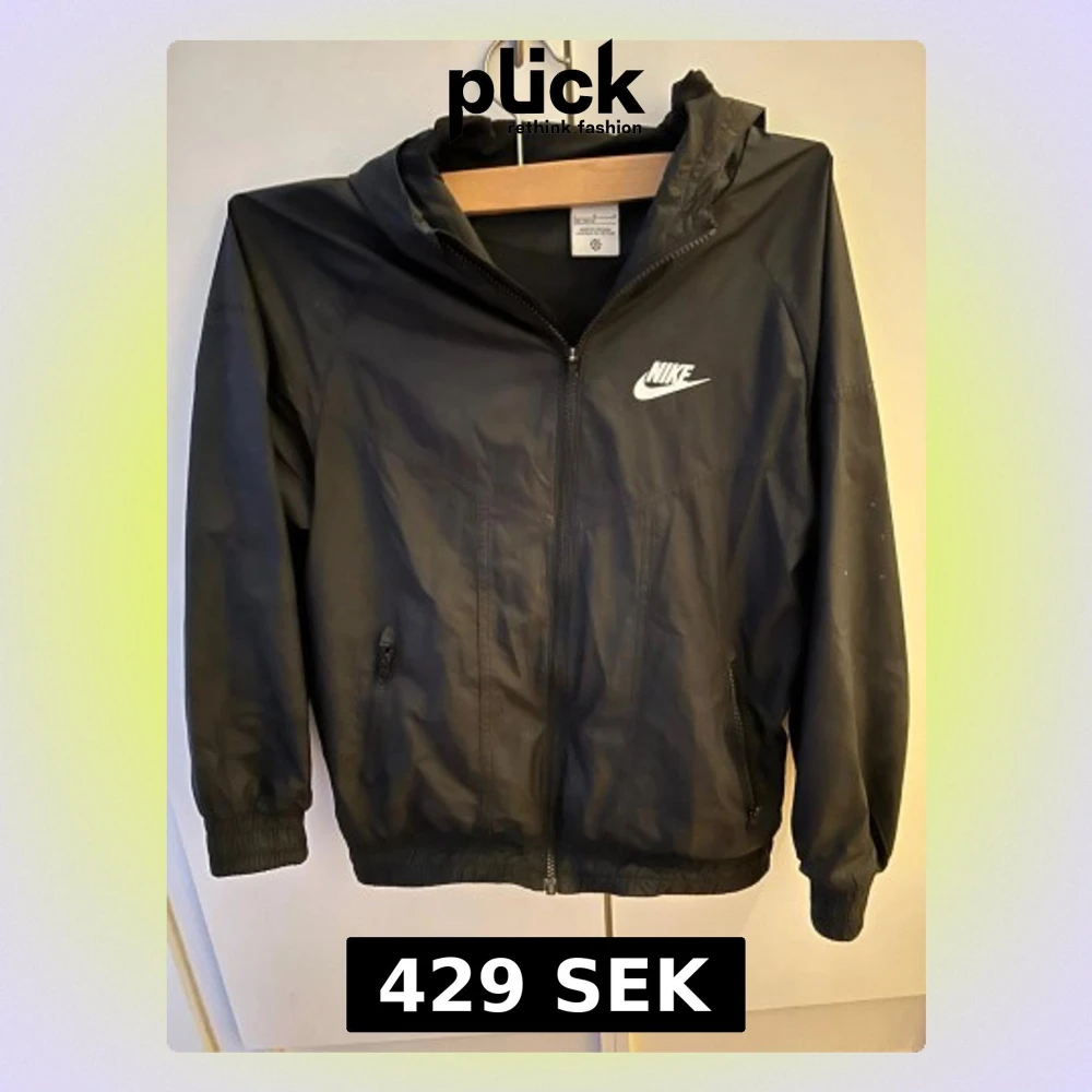 Säljer en svart vindjacka från Nike med huva och dragkedja framtill. Storleken på jackan är 150-158cm. Jackans vänsterficka har dock en dragkedja som är sönder den går fortfarande att stänga men det är lite svårt.