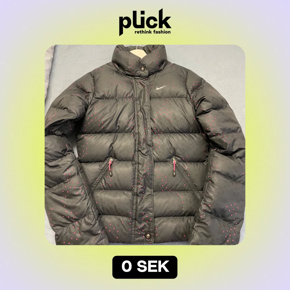 Säljer en snygg, svart dunjacka från Nike med rosa prickar. Den är äkta såklart och nypriset är 1500kr. Den är perfekt för kalla vinterdagar eftersom den är så varm och puffig. Den har aldrig använts, så den är i nytt skick. Jackan är i storlek S men passar mig perfekt som har storlek Xs och sitter även perfekt på min mamma som har storlek M. Tveka inte med att skriva och priset kan sänkas i en snabb affär.