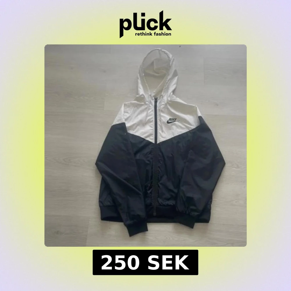 Nike vindjacka i svart och vitt med huva och hel dragkedja framtill. Jackan har klassisk sportig look, elastiska muddar och meshfoder. Snygg tvåfärgad design med Nike-logga på bröstet och detaljerad dragkedja.