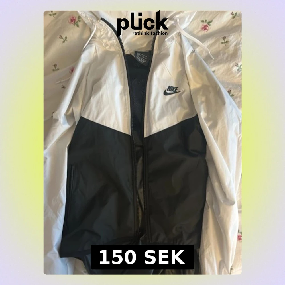 Säljer en stilren svartvit vindjacka från Nike med dragkedja och huva. Jackan har en snygg tvåfärgad design, meshfoder och praktiska fickor med dragkedja. Perfekt för dig som vill ha en sportig look och skydd mot vinden.
