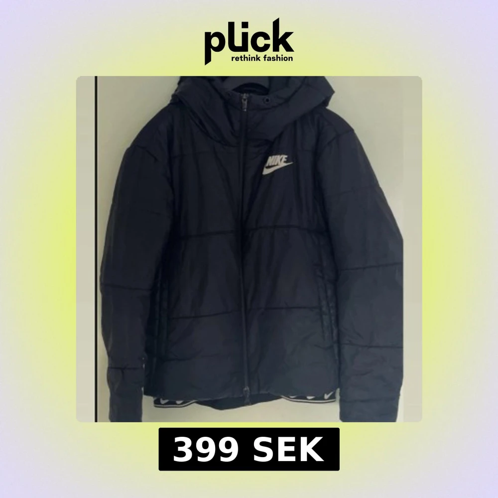 Svart pufferjacka från Nike med huva och dragkedja framtill. Jackan har ett stilrent Nike-logga på bröstet och är quiltad för extra värme. Perfekt för kalla dagar och har en clean streetstyle-vibe.