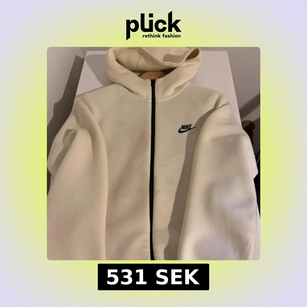 Snygg beige hoodiejacka från Nike med svart logga på bröstet och hel dragkedja framtill. Jackan har huva och är tillverkad i mjukt material, perfekt för en sportig och avslappnad stil.