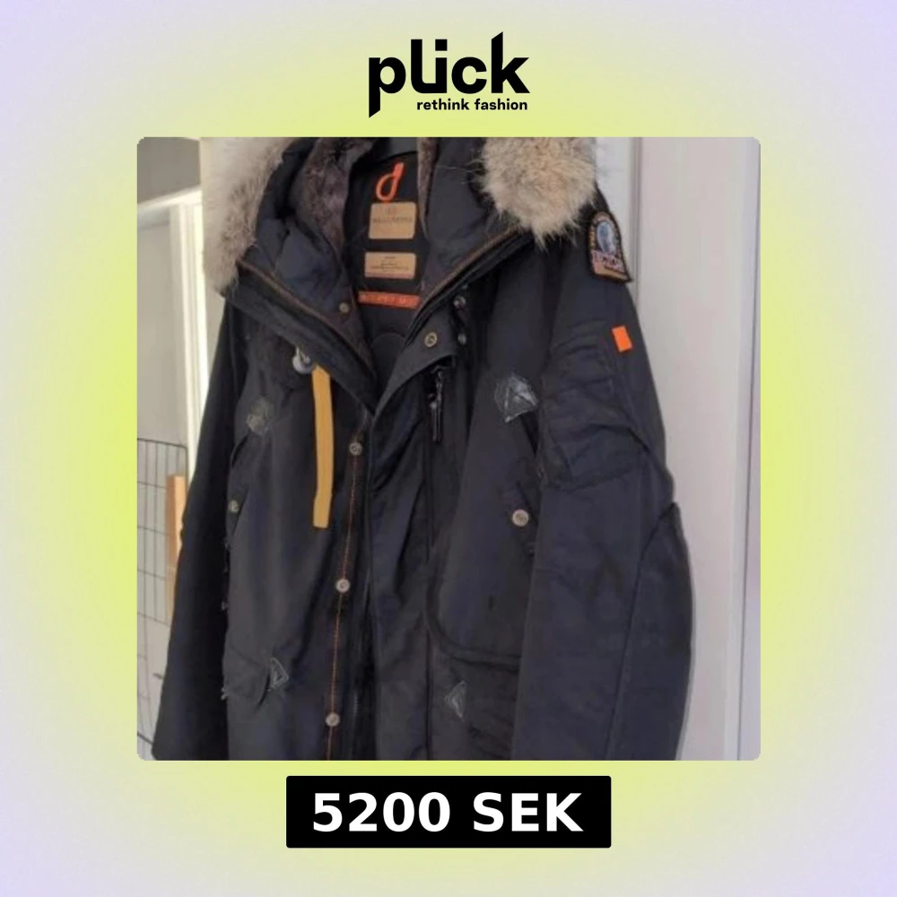 Svart parkajacka från Parajumpers, modell Right Hand, med stor huva och lyxig pälsdetalj. Jackan har flera fickor, snygga knappar och dragkedja samt en gul rem vid halsen. Perfekt för kalla dagar och riktigt stilren look.
