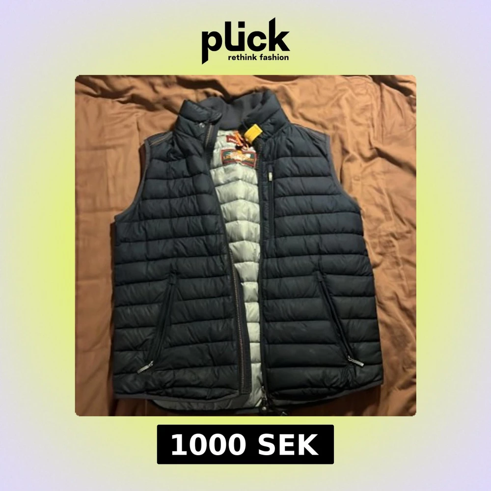 Snygg svart dunväst från Parajumpers i storlek M. Västen har quiltad design, två dragkedjefickor och en hög krage med gul detalj. Insidan är ljusgrå och materialet är lätt och smidigt, perfekt för lager-på-lager. Märkespatch på både insidan och baksidan.