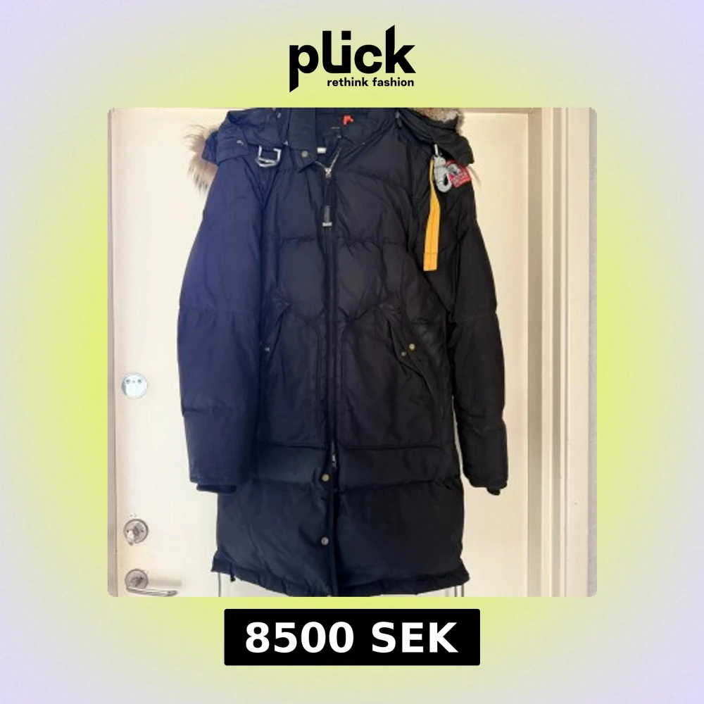 Säljer en svart lång dunjacka från Parajumpers med ikonisk gul rem och patch på ärmen. Jackan har huva med fuskpäls, dragkedja framtill, flera fickor och coola metalldetaljer. Perfekt för kalla dagar och riktigt snygg streetstil.