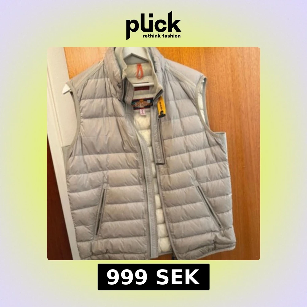 Säljer en stilren ljusgrå dunväst från Parajumpers. Västen har en dragkedja framtill och en hög krage med knappdetalj. Västen är i nyskick med qr cod och kostar 3500 som ny.