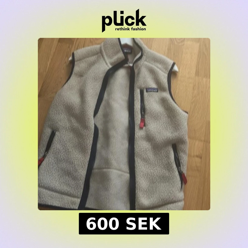Säljer en beige fleeceväst från Patagonia med svarta detaljer och dragkedjor med röda dragare. Västen har hög krage och två sidofickor samt en bröstficka med dragkedja. Perfekt för lager-på-lager och outdoor.