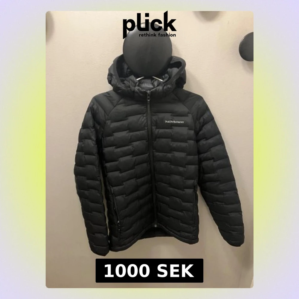 Svart dunjacka från Peak Performance med huva och dragkedja framtill. Jackan har quiltad design och logga på bröstet. Perfekt för kalla dagar och har en stilren look som funkar till det mesta.
