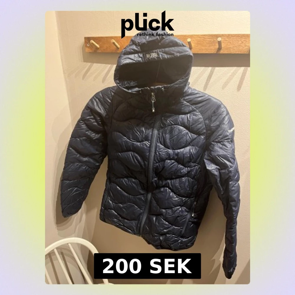 Snygg mörkblå dunjacka från Peak Performance med quiltad design och huva. Jackan har dragkedja framtill och två sidofickor med dragkedja. Ett pyttigt hål fram (se bild, därav pris), i övrigt i bra skick.