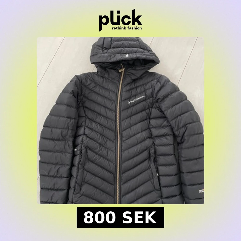 Snygg svart dunjacka från Peak Performance med huva och dragkedja. Jackan har en quiltad design och är perfekt för kyligare väder. Den har en stilren look med diskreta logotyper på bröstet och ryggen.