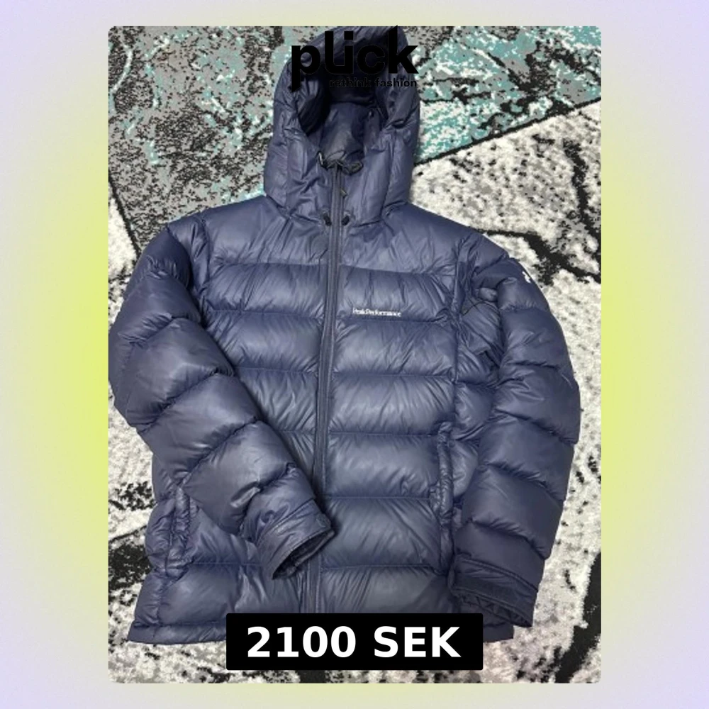 Säljer en mörkblå dunjacka från Peak Performance med huva och dragkedja framtill. Jackan har quiltad design och snörning vid huvan. Perfekt för kalla daga och har en riktigt schysst puffer-look som är både snygg och praktisk.