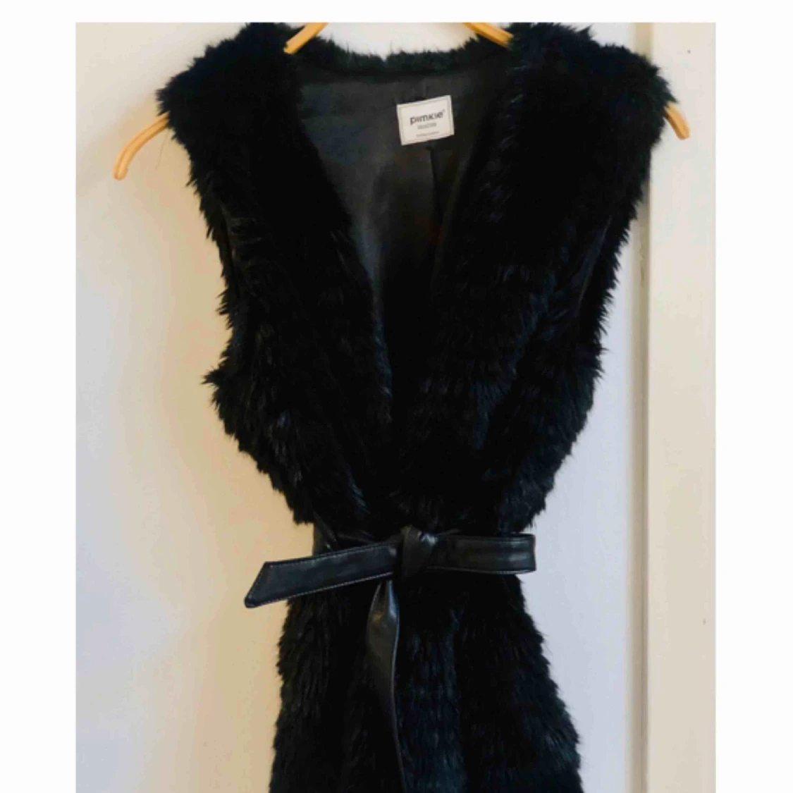 Oanvänd fejk pälsväst. Med fejkskinn som skärp men funkar att använda annat skärp också. Når ned till rumpan. Snyggt över skinnjacka. köpt i Spanien på pimkie butiken