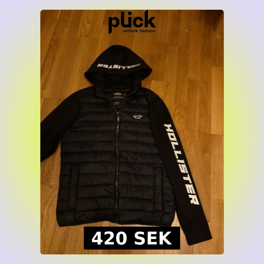 Säljer en svart pufferjacka från Hollister med luva och dragkedja. Jackan har quiltad framsida, släta armar och stora vita logotyper på både arm och luva.