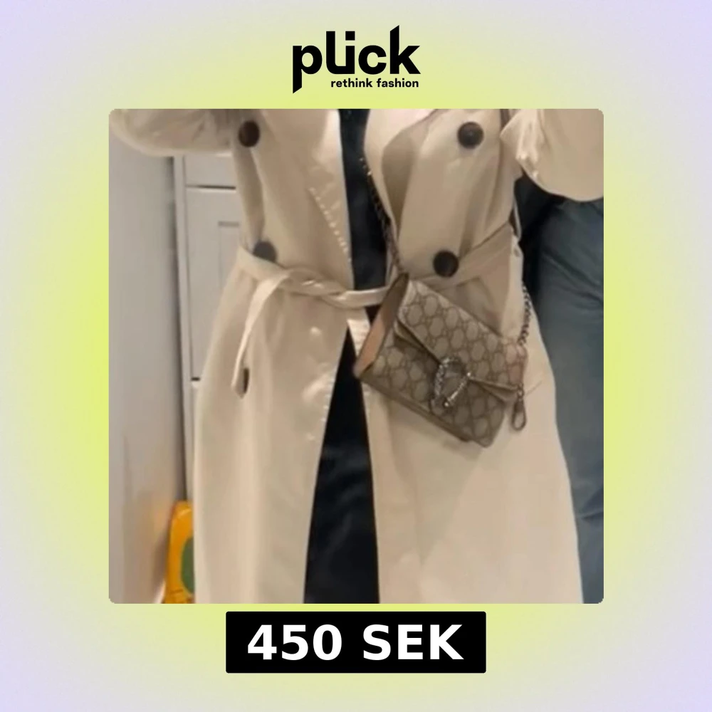 beige trenchcoat från Pull&Bear med krage, stora svarta knappar och bälte i midjan. Lätt material som passar bra till lager-på-lager.