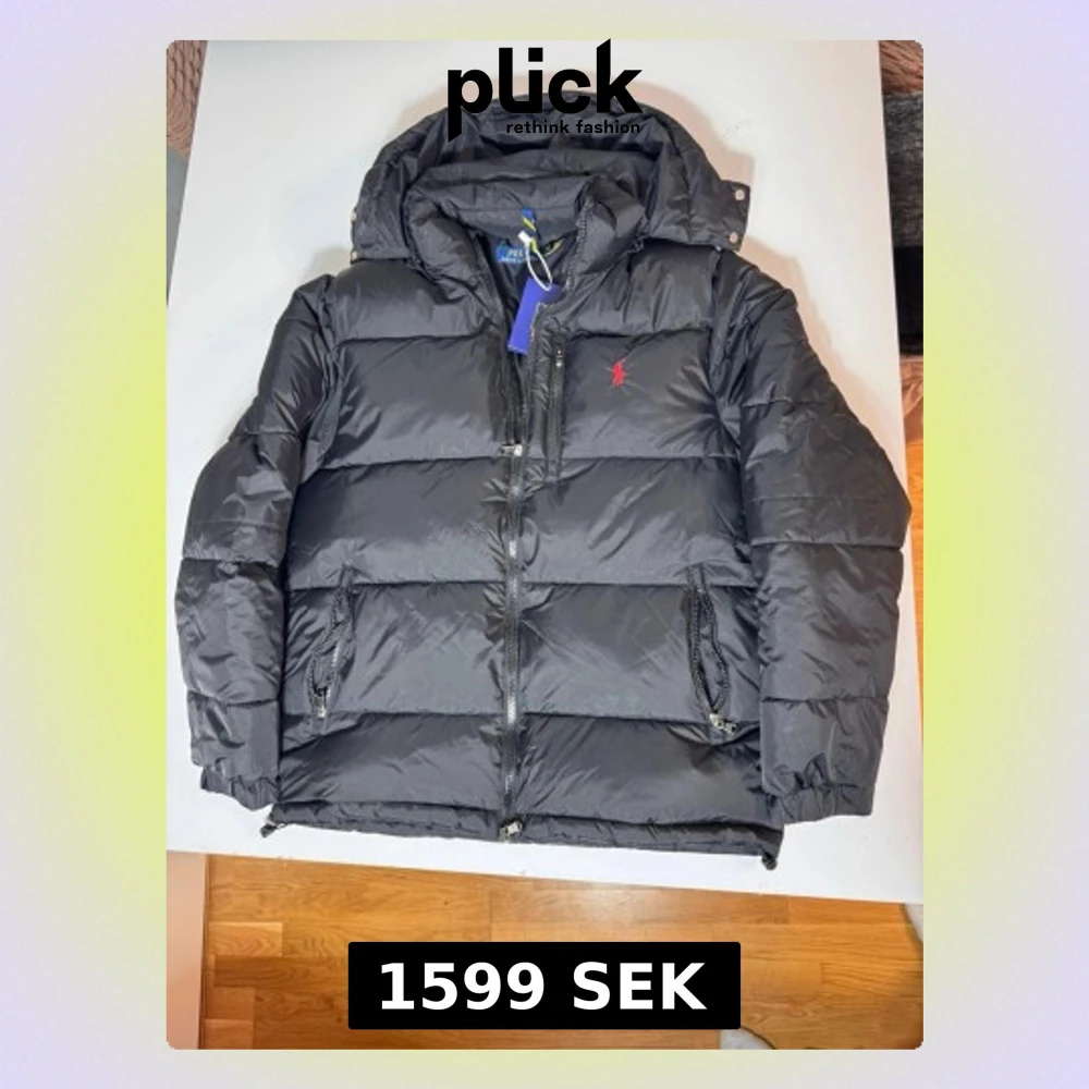 Svart pufferjacka med huva, två sidofickor med dragkedja och röd broderad logga på bröstet. Jackan har en chunky dragkedja framtill och är tillverkad i polyester, perfekt för kalla dagar. Finns i storlek S och M