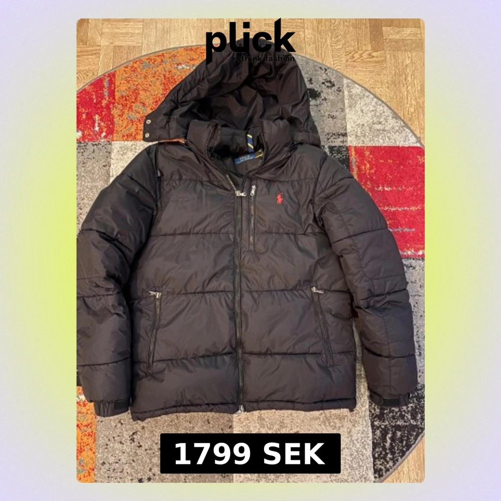 Svart pufferjacka från Polo Ralph Lauren med röd logga på bröstet. Jackan har huva, flera dragkedjeförsedda fickor och quiltad design. Materialet är bomull och polyamid, vilket gör den både varm och skön. Perfekt för kalla dagar och har en clean, stilren look.