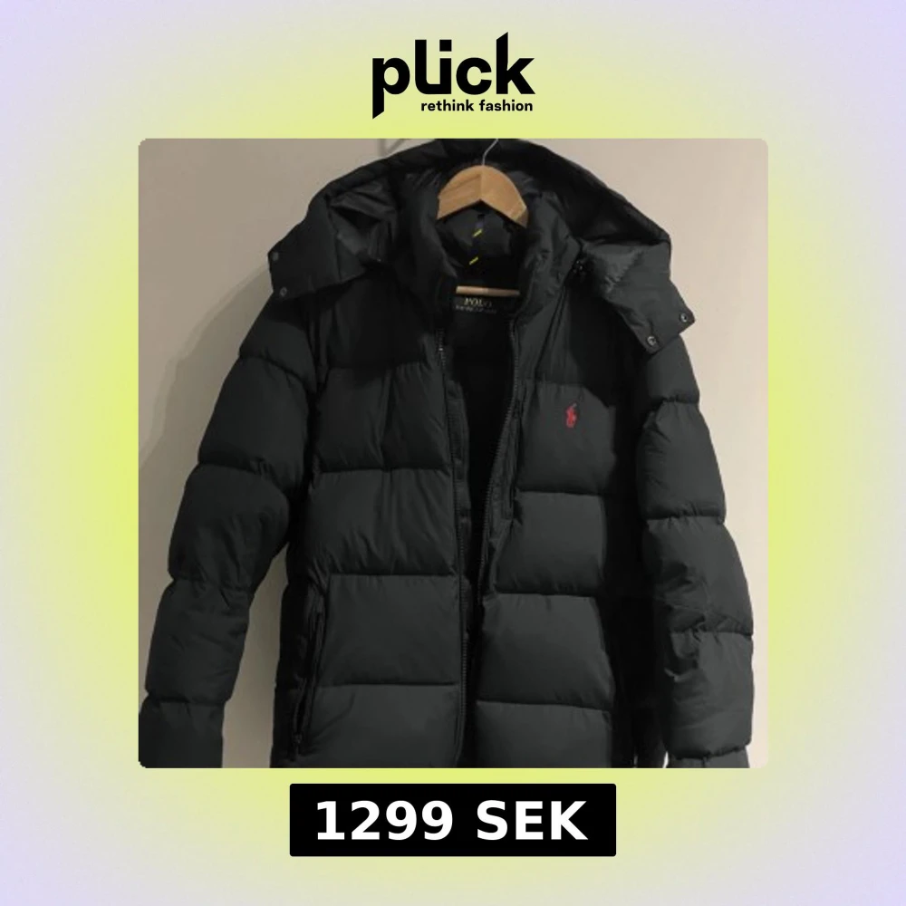Se bild 3 för passform. Jag är 190 och väger 78kg. Svart dunjacka från Ralph Lauren. Jackan har huva, dragkedja fram. Perfekt för kalla dagar och har en klassisk, stilren look. Jackan har en liten söm vid ärmen som öppnats