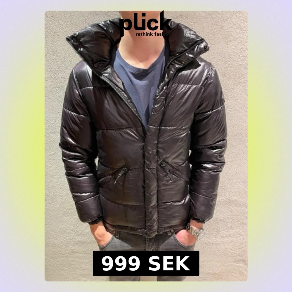 Säljer en svart pufferjacka med hög krage och dragkedja framtill. Jackan har två snedställda fickor med dragkedja och en glansig finish. Perfekt för kalla dagar och riktigt snygg till jeans eller sweatpants.