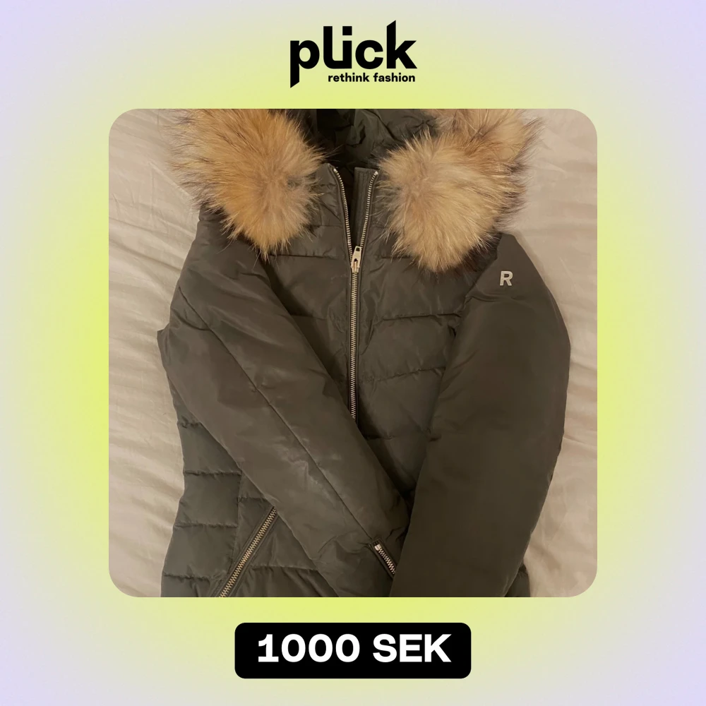 Militärgrön rockandblue vinterjacka med fina gulddetaljer. Pälsen är äkta och fluffig fortfarande med en kall jättefin färg. Den sitter väldigt smickrande på.