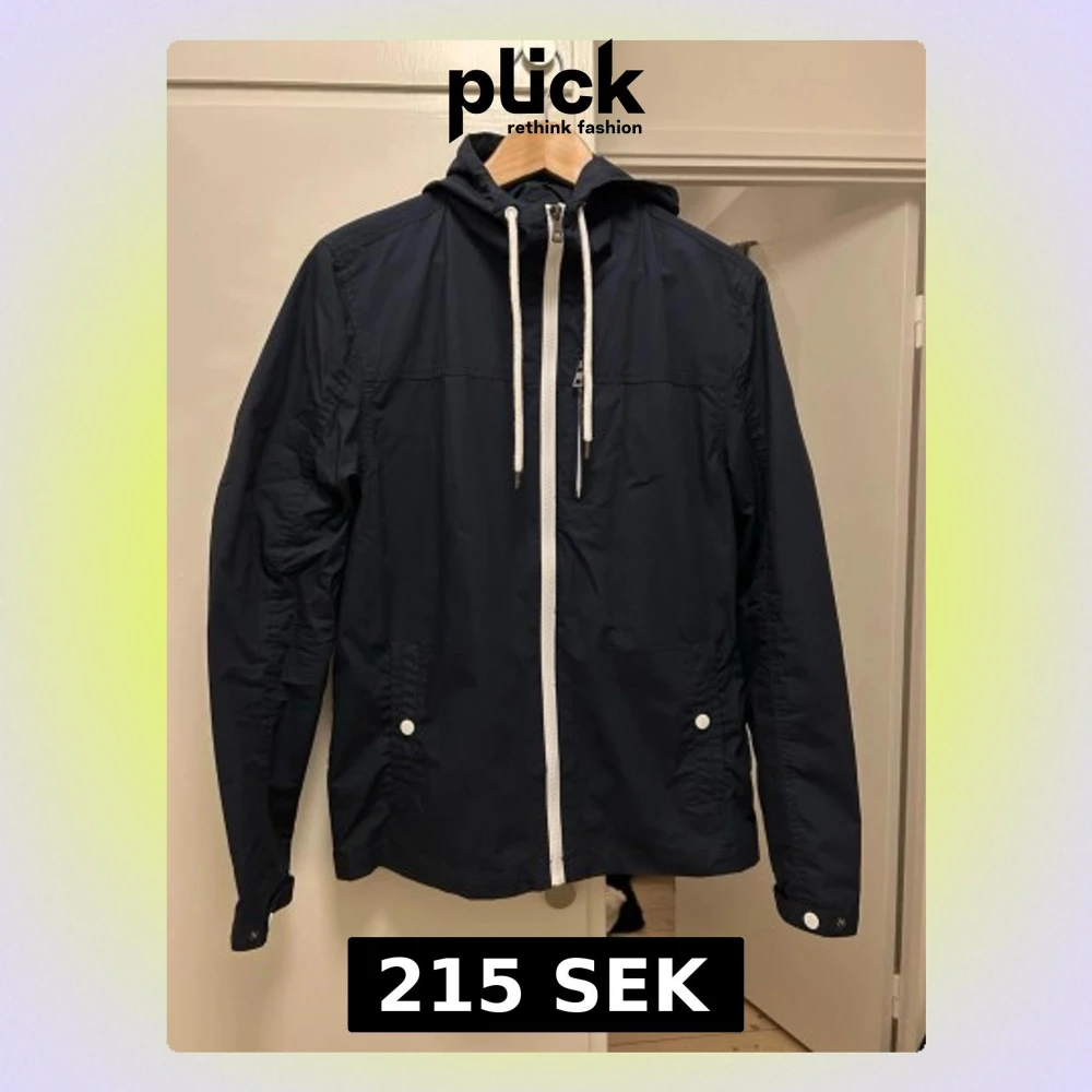 Snygg mörkblå vindjacka från pier one med vit dragkedja och vita snören i huvan. Jackan har två fickor med knappar framtill och justerbara ärmslut. Perfekt för blåsiga dagar och enkel att matcha med olika outfits.