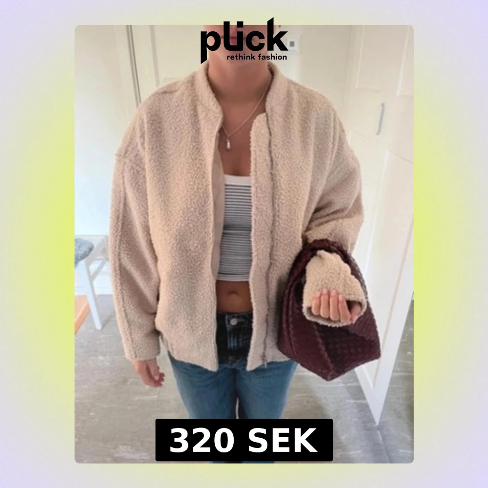 Mysig beige teddyjacka med oversized passform och lång ärm. Jackan har en enkel design utan synliga knappar eller dragkedja framtill och är tillverkad i fluffigt teddy-material. Perfekt för att hålla värmen under kyliga dagar.