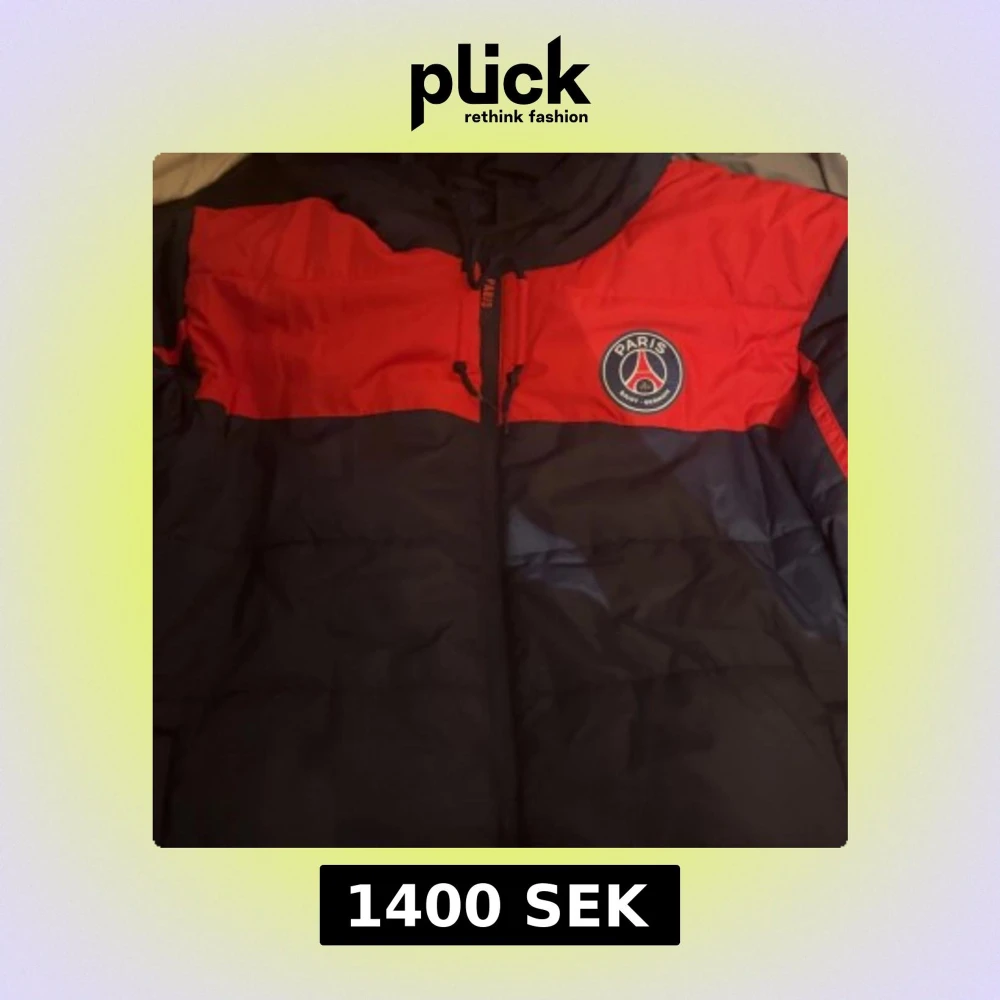 Säljer en snygg röd och marinblå jacka från Paris Saint-Germain. Jackan har en dragkedja framtill och klubbens logga på bröstet. Perfekt för fotbollsfans som vill visa sitt stöd med stil.