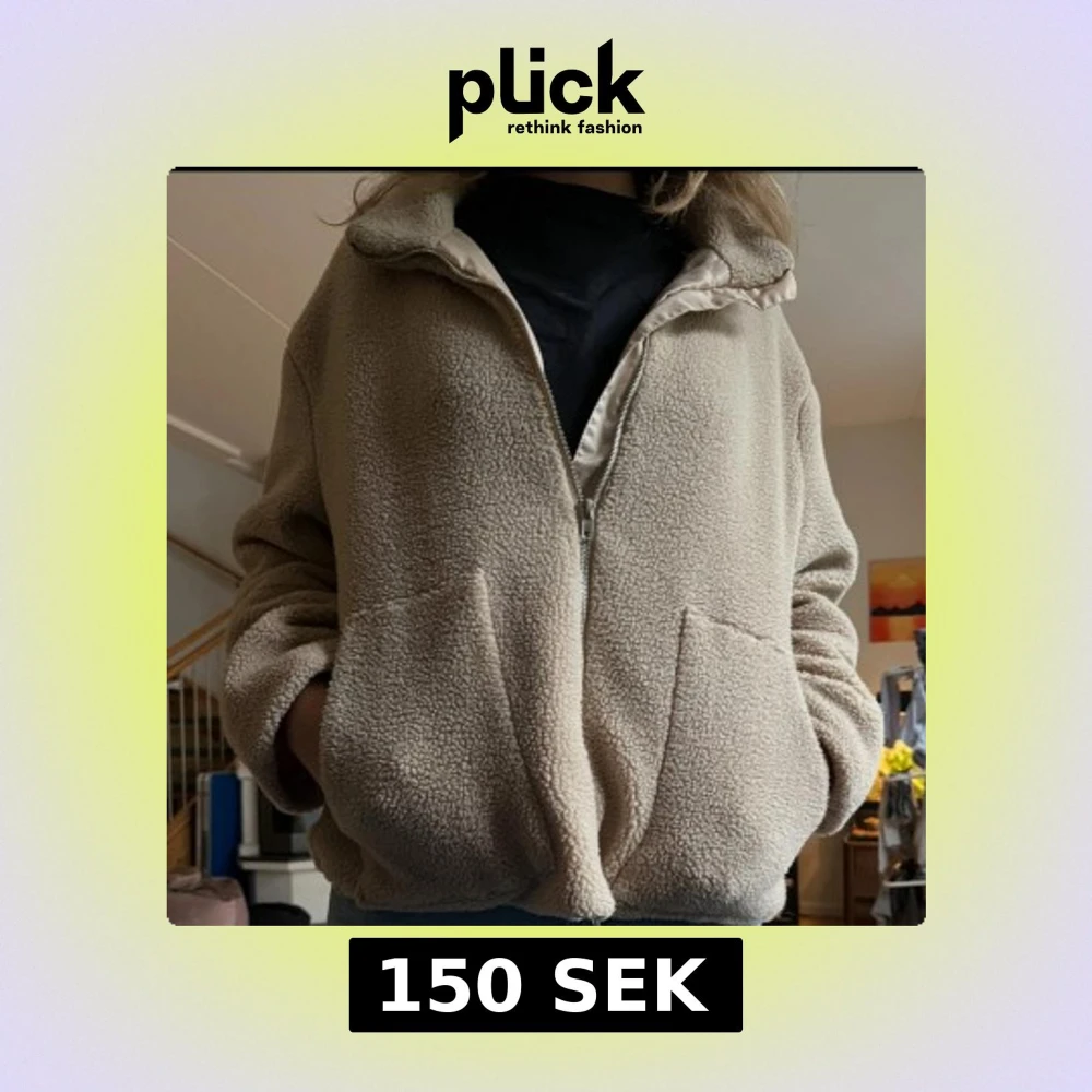 Mysig beige teddyjacka med dragkedja framtill och två stora fickor. Jackan har en hög krage och är tillverkad i fluffigt fleece-material som håller dig varm. Perfekt för kyliga dagar och ger en chill vibe till din outfit.