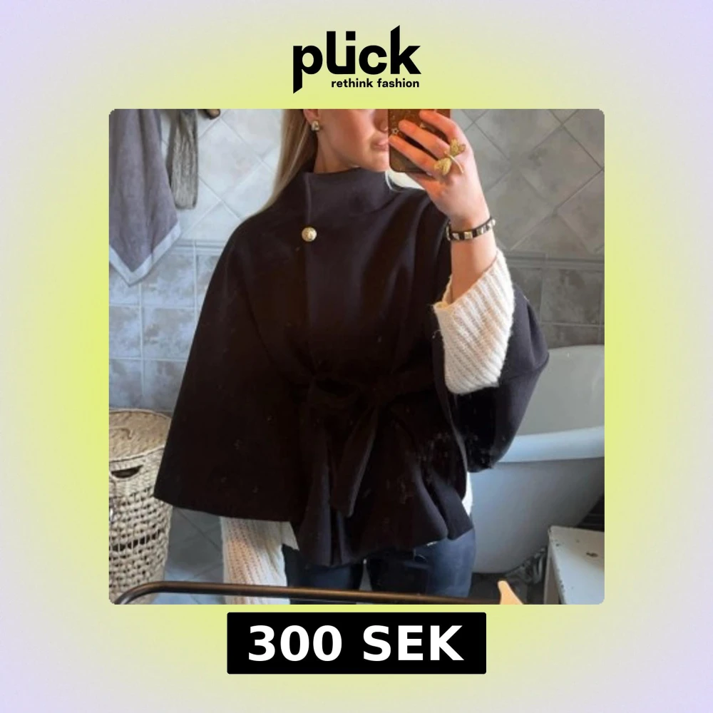 Snygg svart kappa med hög krage, dekorativ knapp vid halsen och knytband i midjan. Modellen är vid och har en cape-liknande form som ger en cool och trendig siluett. Perfekt för dig som gillar stilrena och unika plagg.