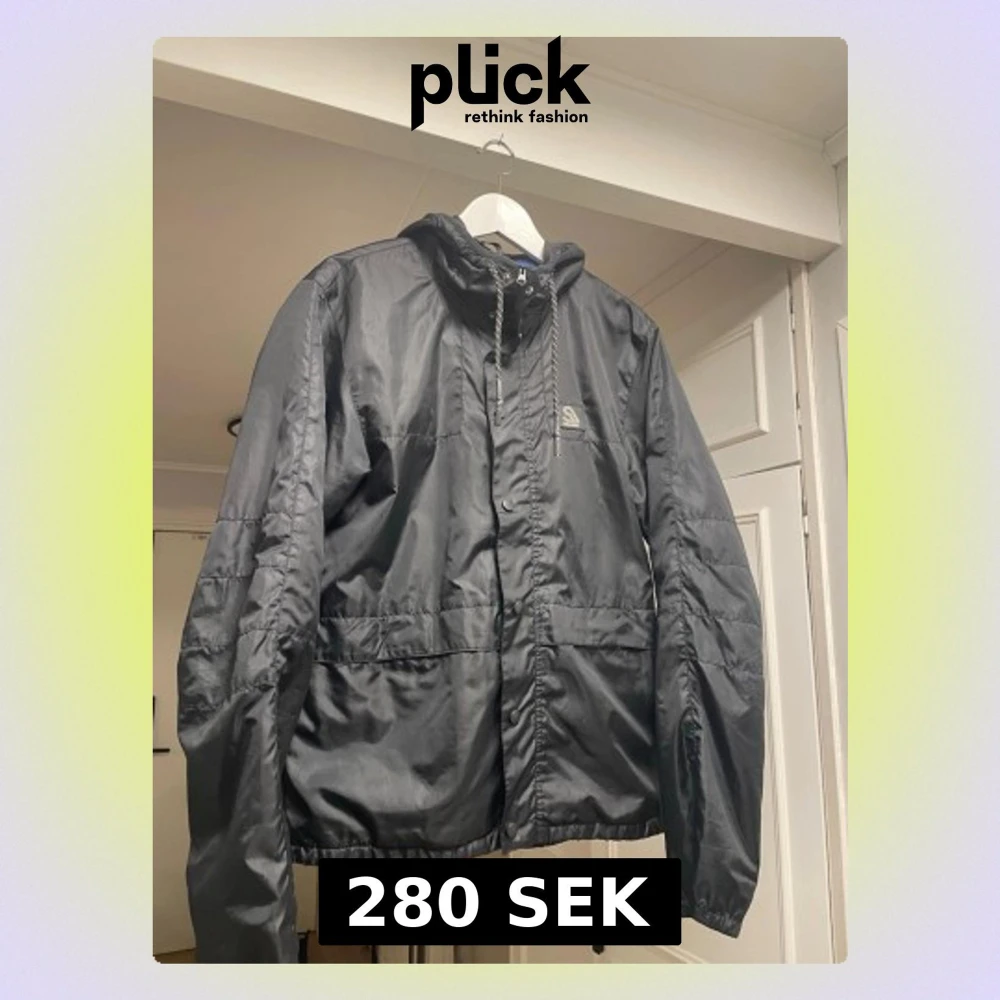 Säljer en svart vindjacka från Slazenger med huva och dragsko. Jackan har dragkedja och tryckknappar framtill samt två stora fickor. Perfekt för blåsiga dagar och enkel att slänga på sig. Materialet är lätt och känns smidigt. Storlek S passar bra till M