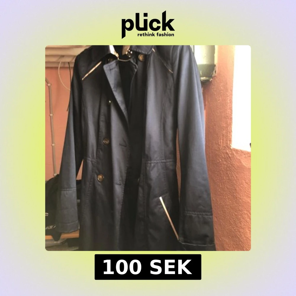 Snygg mörkblå trenchcoat med knappar och bälte i midjan. Jackan har långa ärmar och stilrena detaljer i ljusare färg vid fickorna och längs ryggen. Perfekt för en elegant look.