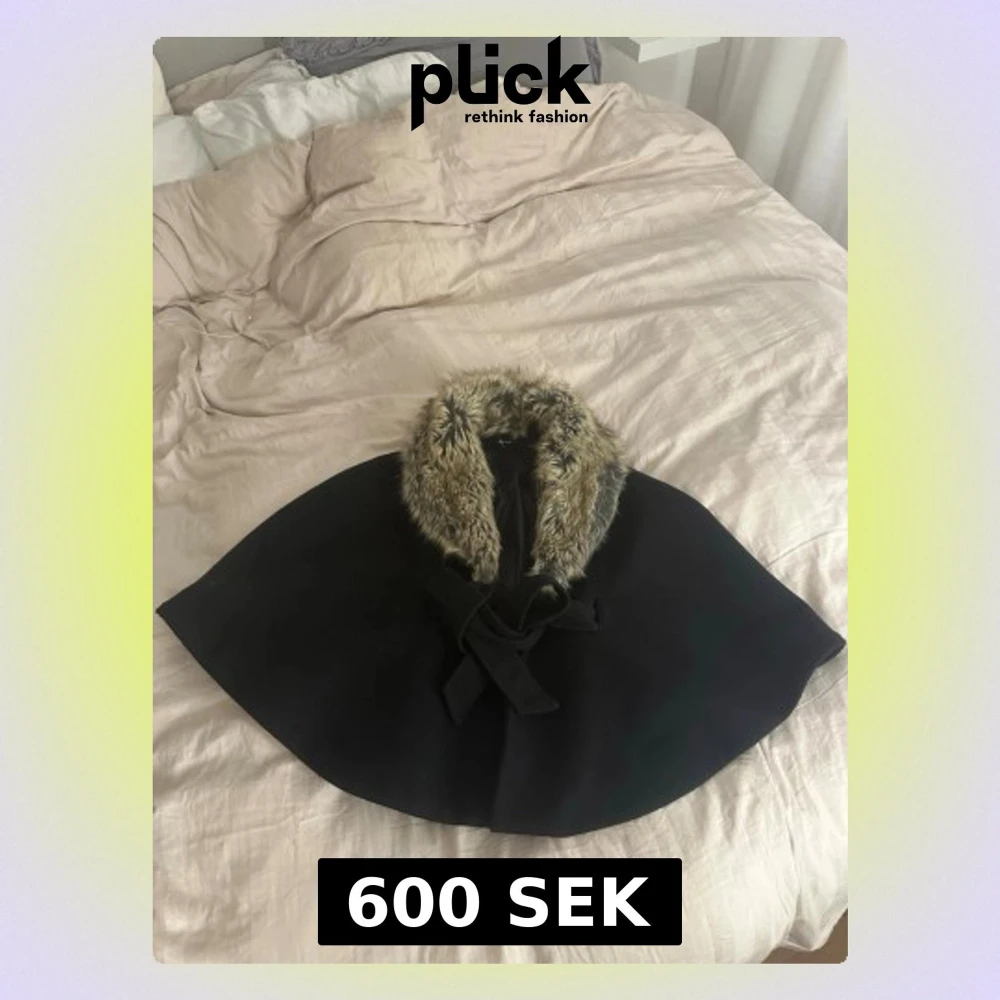 Säljer en svart kappa från H&M med bred krage i fuskpäls och snyggt knytband framtill. Kappan har en elegant och svepande form som ger en cool vibe, perfekt för dig som vill sticka ut lite extra. Pälsen är i beige och bruna toner.
