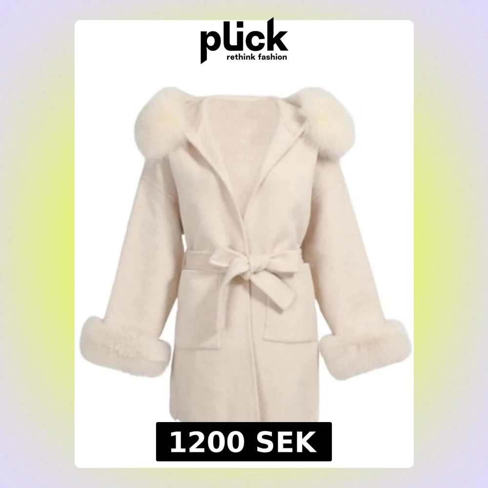 Snygg beige pälskappa med fluffiga detaljer på huva och ärmslut. Jackan har ett bälte i midjan för att knyta och stora fickor framtill. Kappan är i storlek S och använd ett fåtal gånger. Köpt för 2300 kr hos Fur Stockholm men säljs för 1200 kr.