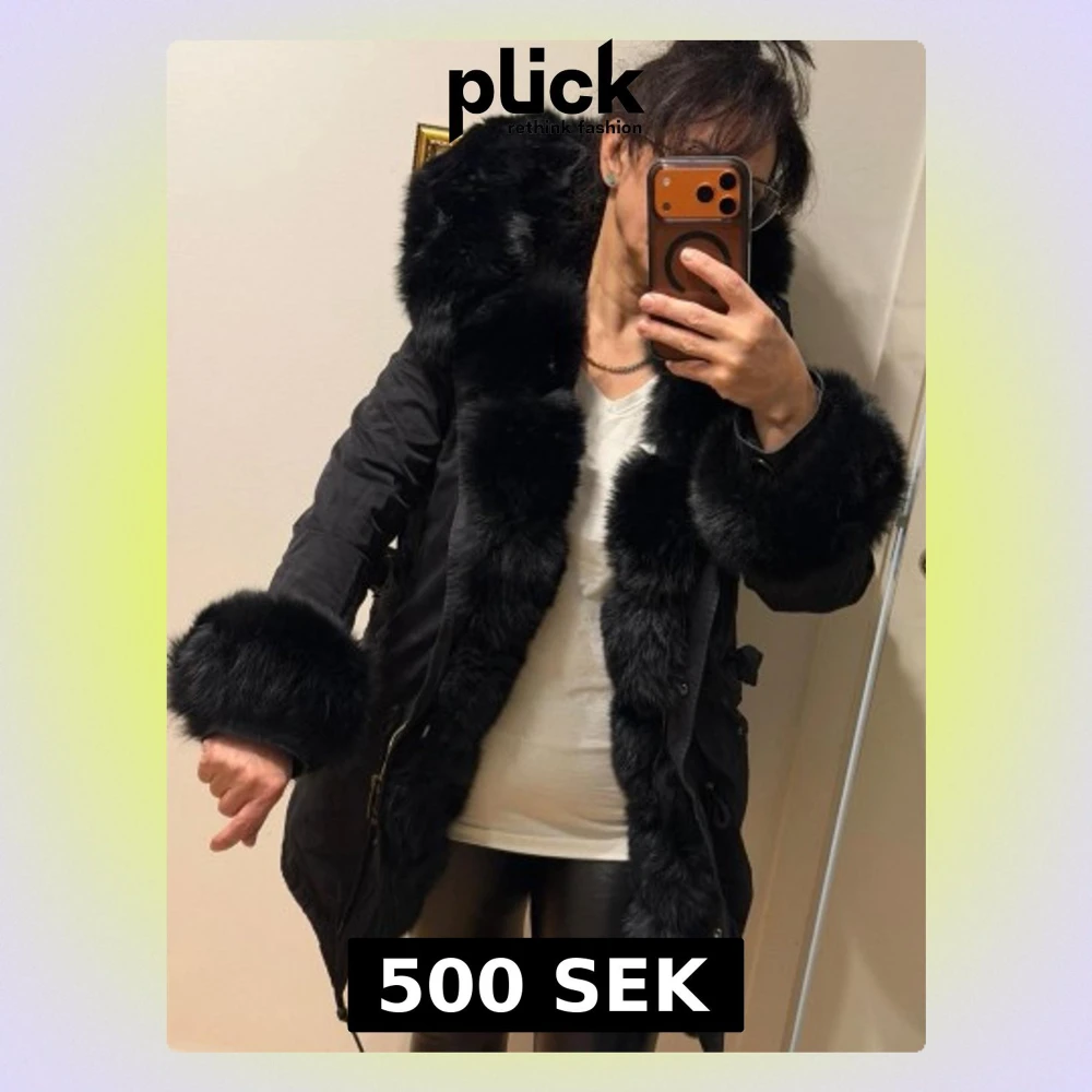 Säljer en svart parkajacka med stora fluffiga pälsdetaljer på huva, ärmslut och längs öppningen. Jackan har dragkedja framtill och snörning i midjan för snygg passform. Perfekt för kalla dagar när du vill vara både varm och stilren. Passar en XS-S och en M
