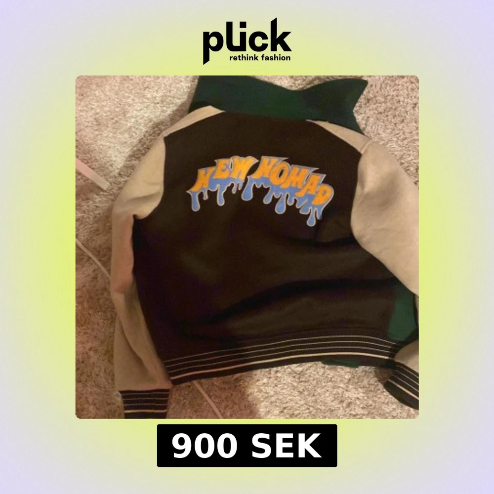 Säljer en fet bomberjacka från Woodbird med grön och brun kropp, beige ärmar och coola broderade detaljer. Jackan har tryckknappar, randiga muddar och tryck på både fram- och baksida med texten 'New Nomad'. Perfekt statement-plagg för streetwear. 1200kr kosta den ny knappt använd priset kan sänkas