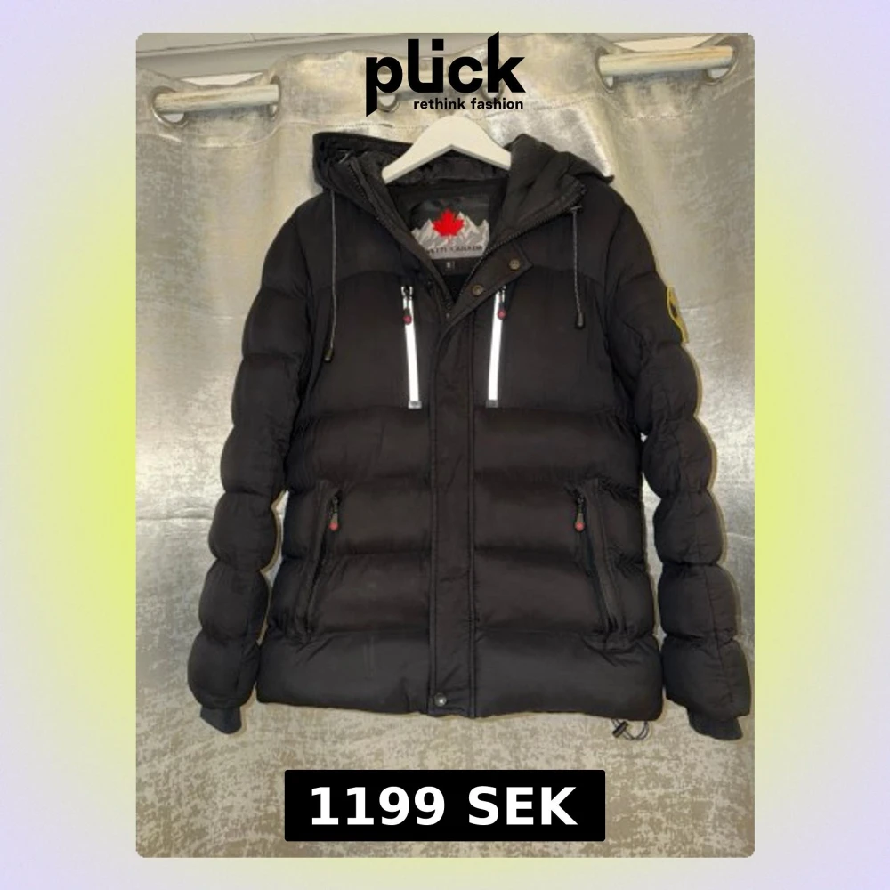Säljer en svart pufferjacka från Zavetti Canada med huva och feta vadderade paneler. Jackan har fyra dragkedjeförsedda fickor, coola vita detaljer på bröstet och ett broderat märke på ärmen. Perfekt för kalla dagar och riktigt snygg streetstil. Passar S och M. Priset kan diskuteras