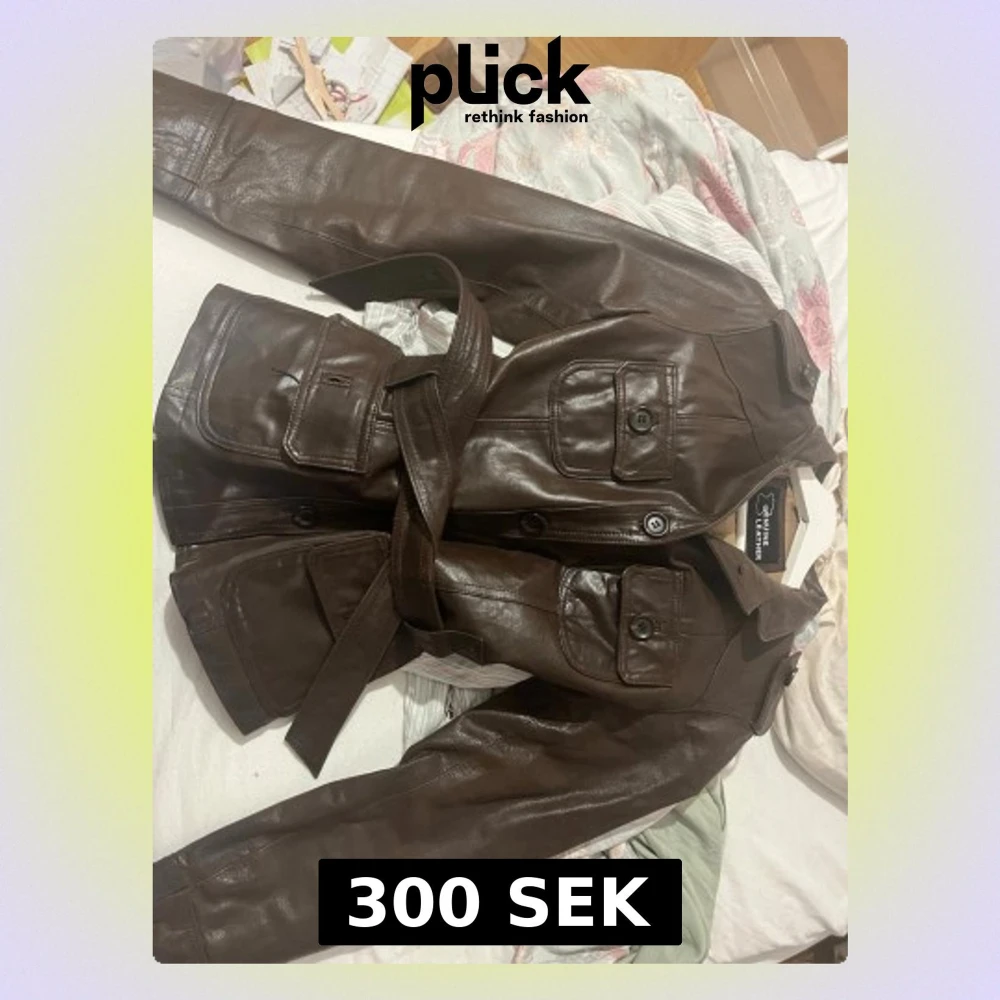 Säljer en brun skinnjacka från Genuine Leather med fyra stora fickor framtill, knappar hela vägen och ett matchande bälte i midjan. Jackan har klassisk krage och axelklaffar för en cool look. Perfekt för dig som vill ha en tidlös och snygg jacka.