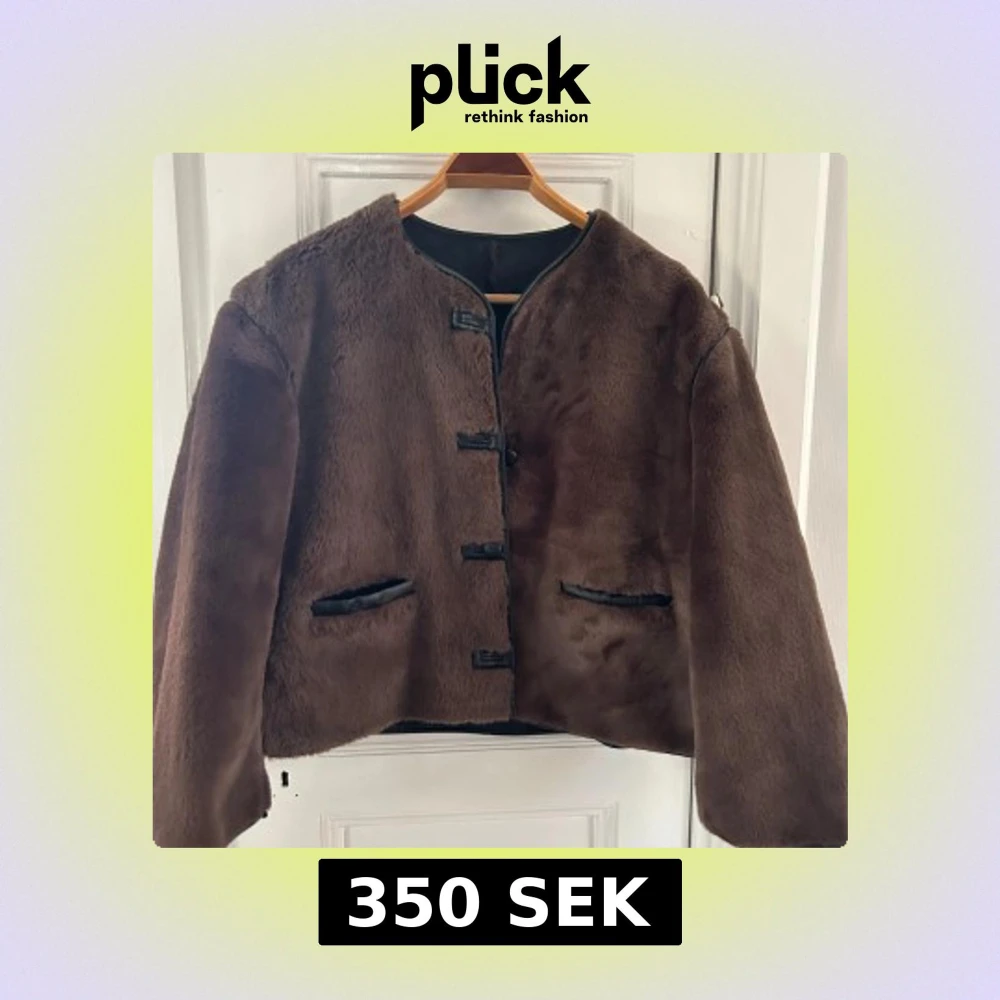 Mysig brun pälsjacka med raka linjer och snygga detaljer i svart skinn vid knäppning och fickor. Jackan är croppad och har lång ärm, perfekt för kalla dagar när du vill ha en cool och trendig look. En av knapparna har lossnat, men jag har kvar knappen så det är lätt att sy på igen. Inte hundra på storlek, men skulle säga att den passar xs-m beroende på passform.