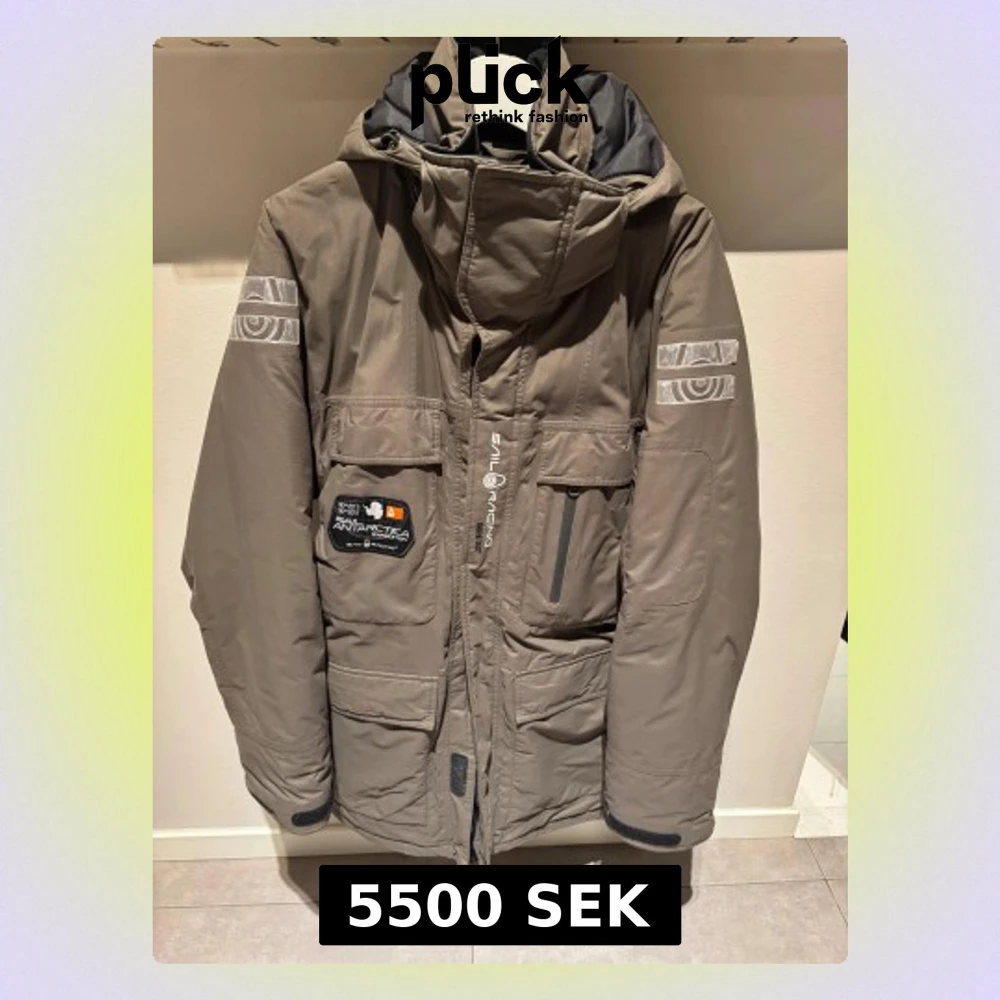 Grön färg med broderade loggor och patch 'Antarctica Expedition'. Jackan har flera fickor, huva och detaljer i silver. perfekt för kalla dagar. Snygga reflexdetaljer på ärmarna och dragkedja framtill.