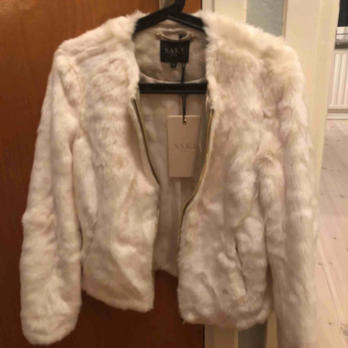 Vit superfin och mjuk fusk pälsjacka med guldig dragkedja. Aldrig använd då den tyvärr är lite för stor för mig. Storlek 36, nypris 1299kr, sälj för 400kr och då ingår frakt. Kan även mötas upp i Uppsala