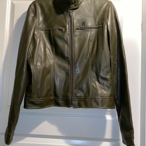 Jacka i kortare modell i grönt fejkskinn från Vero Moda. Dragkedja och ståkrage med tryckknappar. Storlek L, men kan passa från S till L beroende på hur man vill ha den. Jag som har den på bilden har stl XS. Det finns en svart fläck på framsidan, se bild!