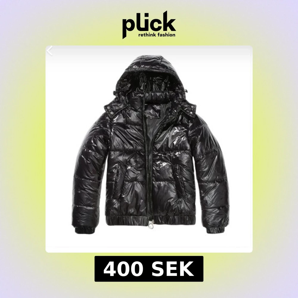 Säljer en svart pufferjacka med glansig finish och huva. Jackan har quiltad design, dragkedja framtill och elastiska muddar vid ärmslut och nederkant. Perfekt för dig som vill ha en cool och varm jacka med streetkänsla.