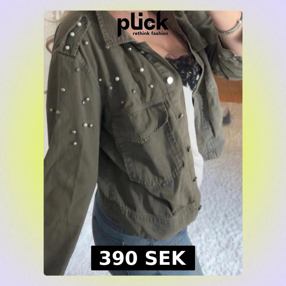 Snygg militärgrön jacka/ overshirt med silverfärgade nitar på axlar och ärmar. Jackan har två bröstfickor med lock, klassisk krage och knappar framtill. As snygg till våren💞