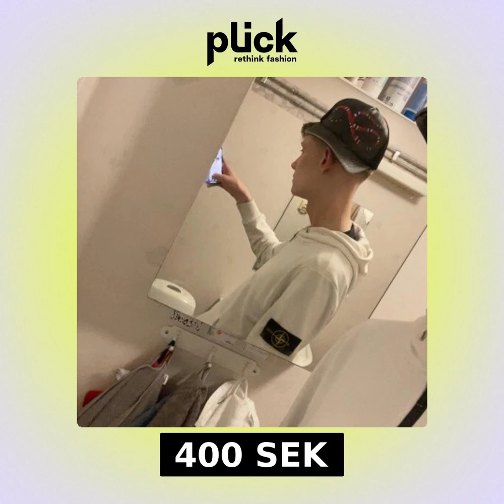 Säljer en stilren vit hoodie från Stone Island med dragkedja och deras ikoniska märke på ärmen. Perfekt för en casual look. Den har en bekväm passform och är långärmad.