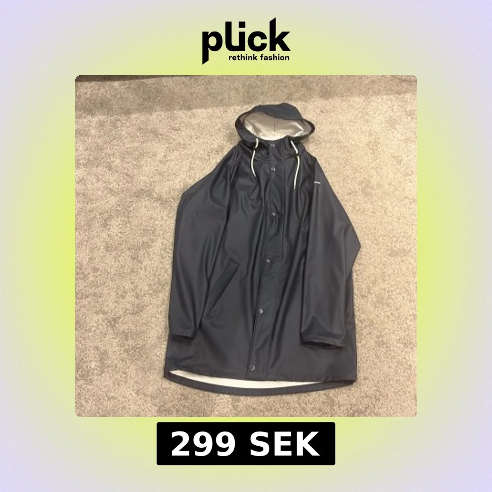 Snygg mörkblå regnjacka med vit insida och huva med snörning. Jackan har knappar framtill, två sidofickor och en stilren, rak passform. Perfekt för regniga dagar och håller dig torr med sin vattenavvisande yta.