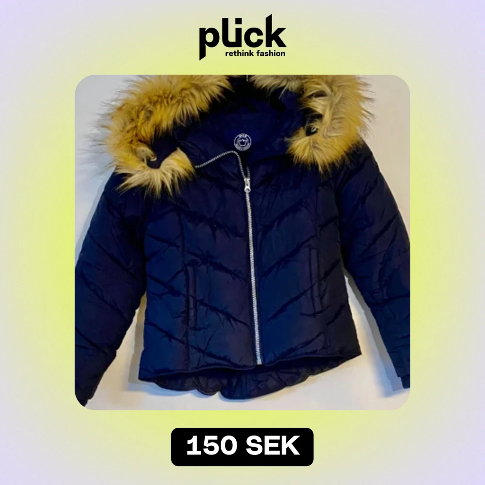 Mörkblå jättesnygg täckjacka med pälsförsedd luva. Obetydligt använd. Hämtas, Gamla Råslätt, endast swishbetalning