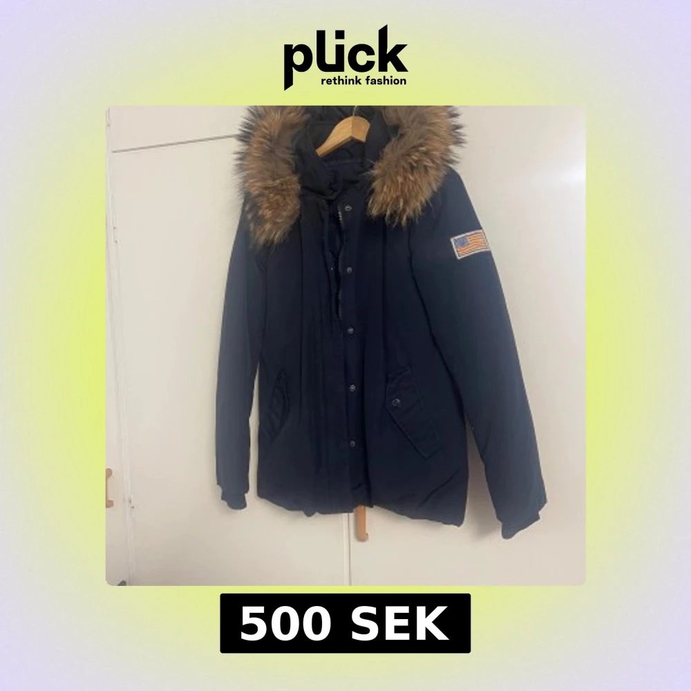 Snygg mörkblå parkas från Svea med stor huva och fuskpäls runt kanten. Jackan har dragkedja och knappar framtill, två fickor med lock och en amerikansk flagga på ärmen. Perfekt för kalla dagar och riktigt skön passform.