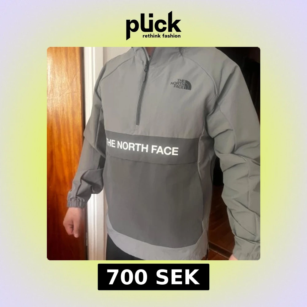 Säljer en grå vindjacka från The North Face med huva och halv dragkedja framtill. Jackan har en stor logga över bröstet och elastiska muddar vid ärmsluten. Perfekt för blåsiga dagar och enkel att slänga på sig.