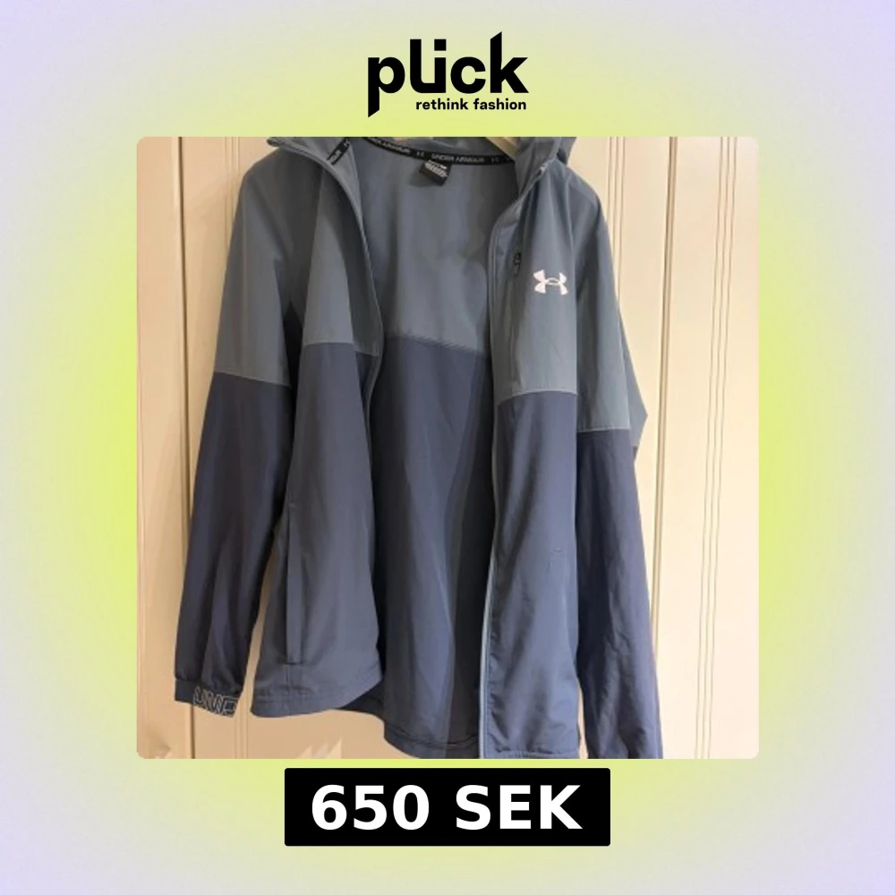 Snygg tvåtonad blå vindjacka från Under Armour med huva och vit logga på bröstet. Jackan har dragkedja framtill, elastiska muddar med tryckt text och en sportig look. Perfekt för dig som gillar streetstyle och funktionella plagg. Priset kan diskuteras vid snabb affär