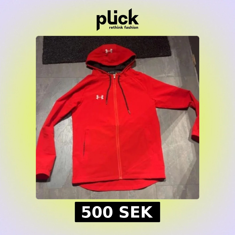 Riktigt snygg röd vindjacka från Under Armour med huva och hel dragkedja. Jackan har svarta detaljer, två fickor framtill och logga på bröstet och huvan. Perfekt för dig som vill ha en sportig look och gillar streetstyle.